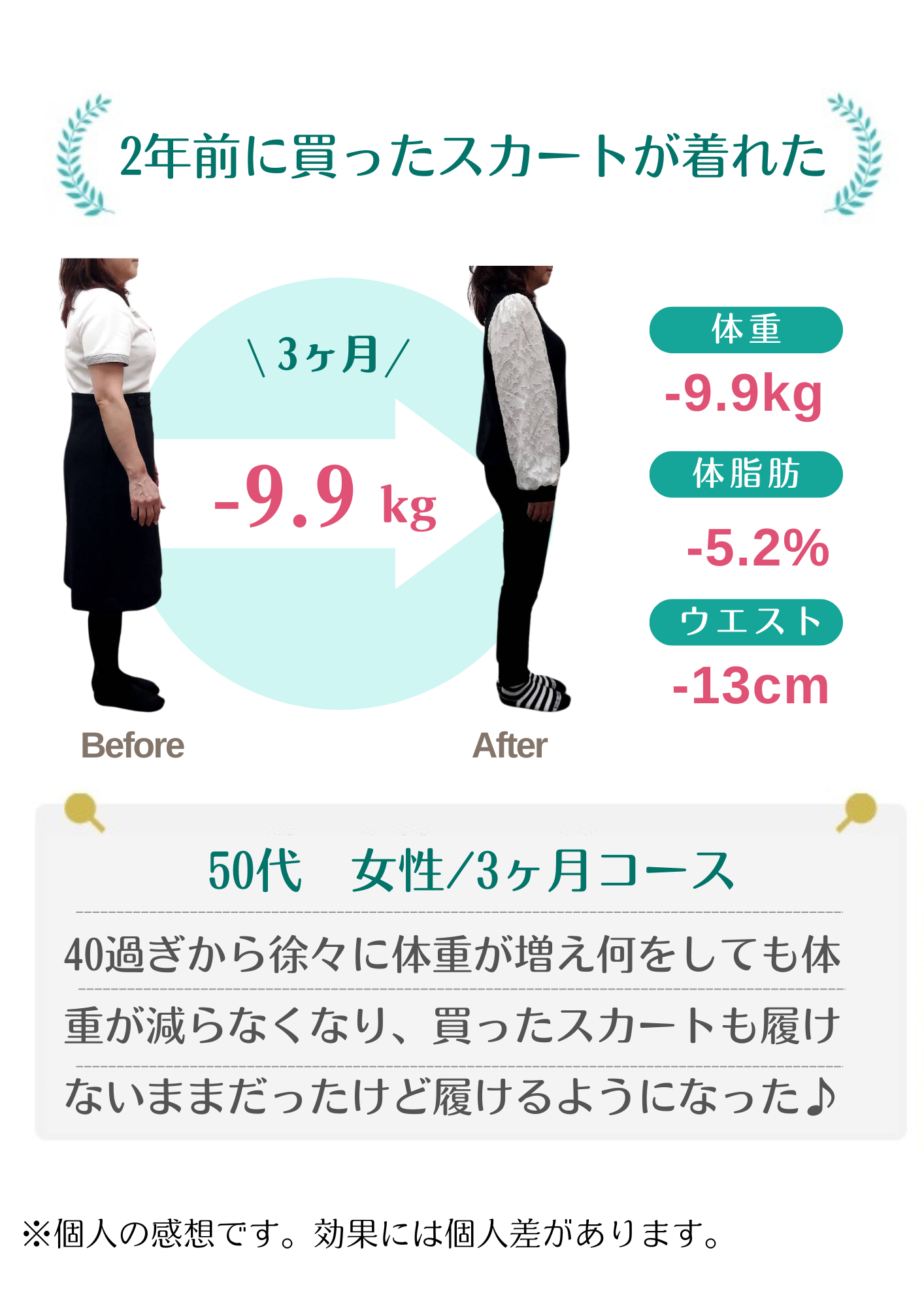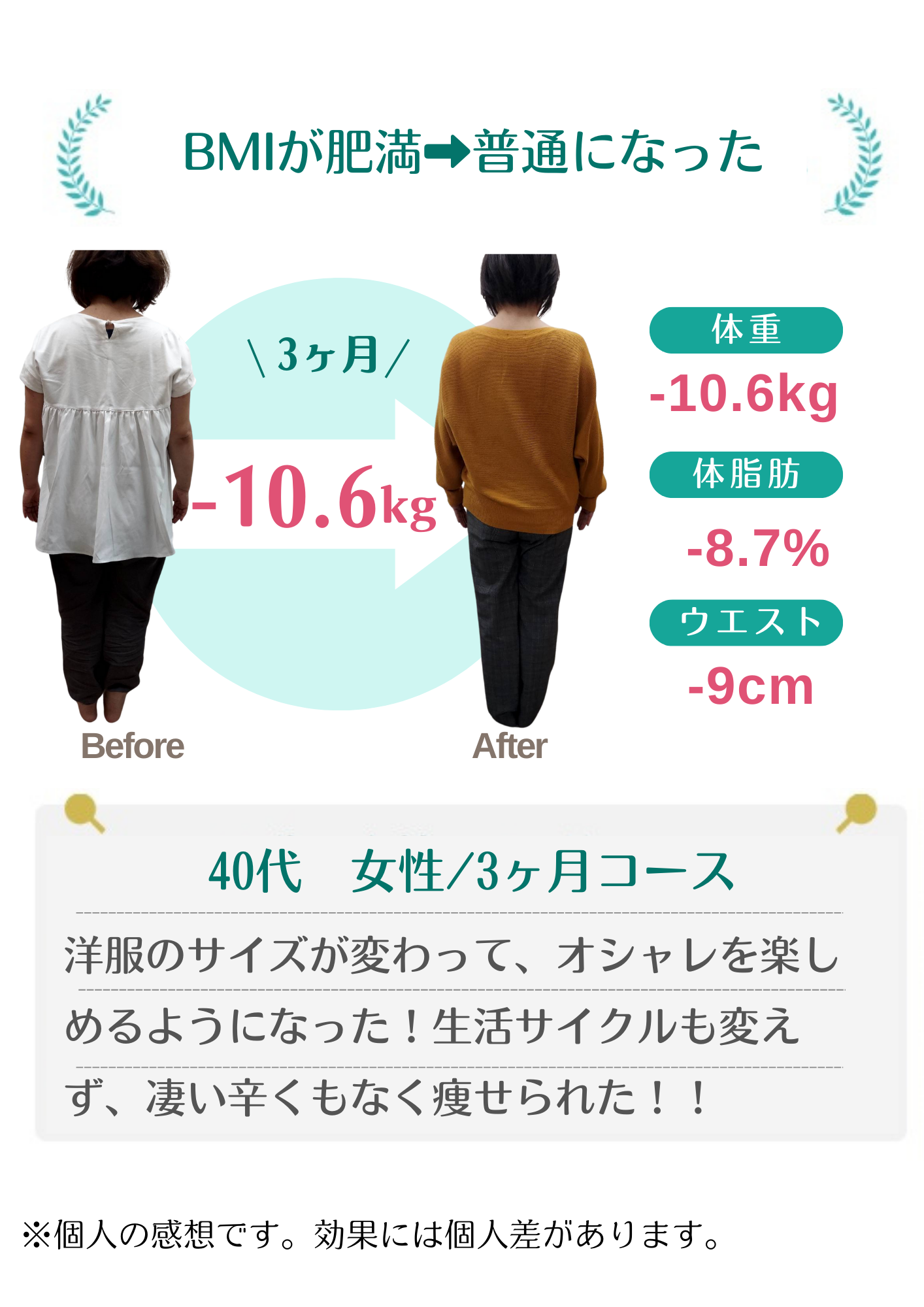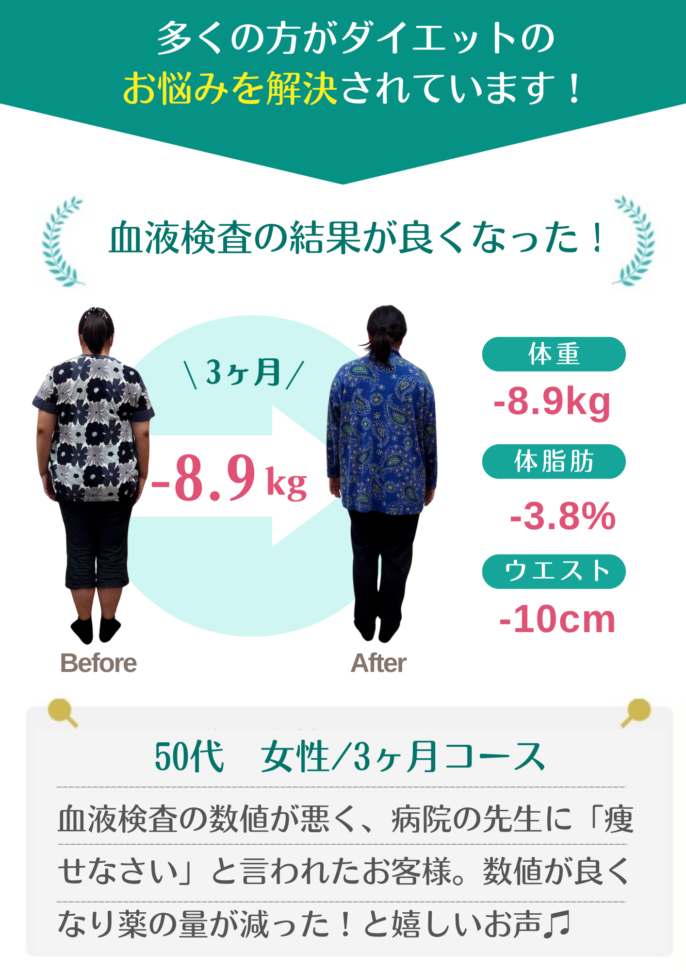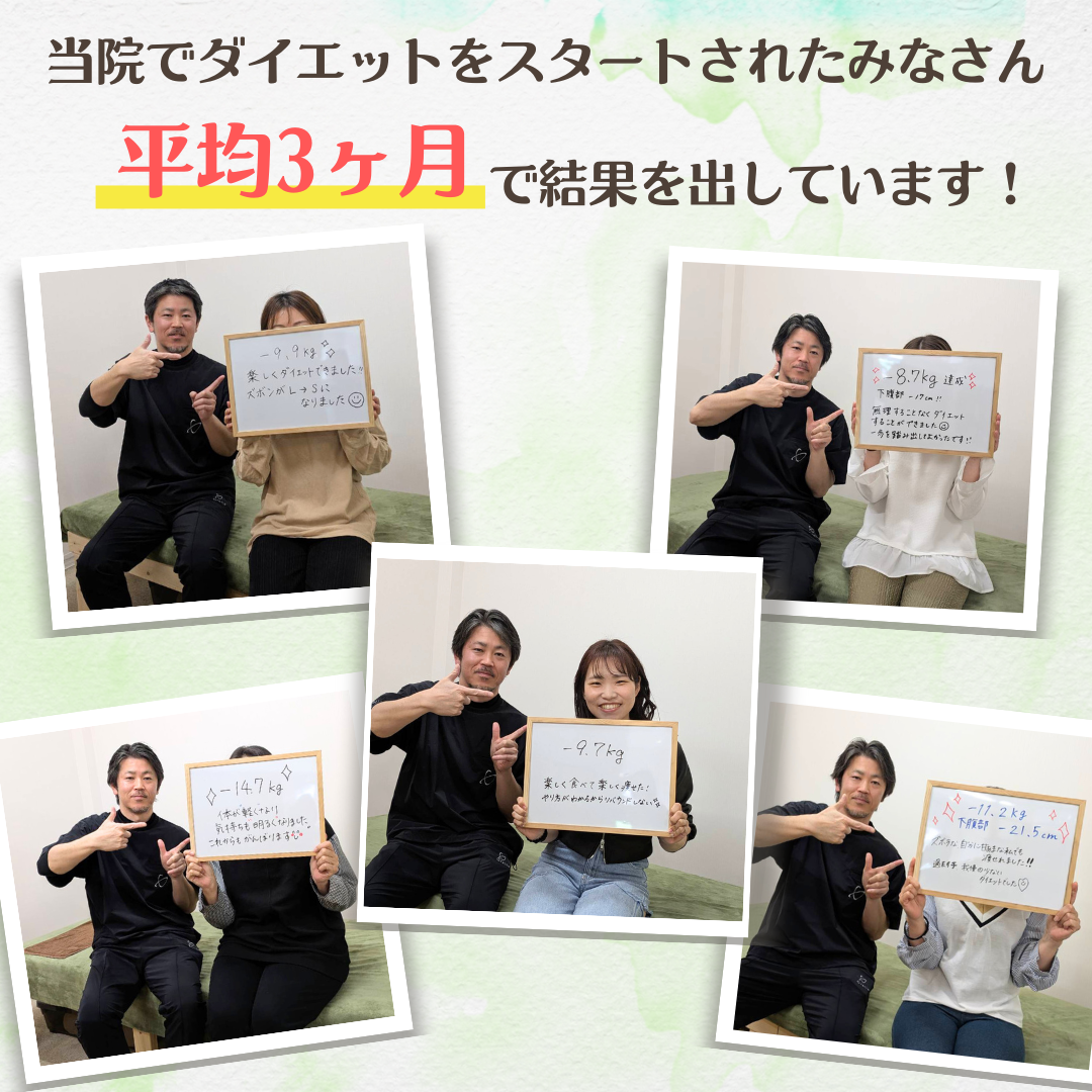 当院のダイエットで自分では痩せられない体だと思っていた方が数十年ぶりの体重に戻せました!と喜ばれる方もおります。年齢・性別に関係なく、みなさんしっかり結果が出ています。
