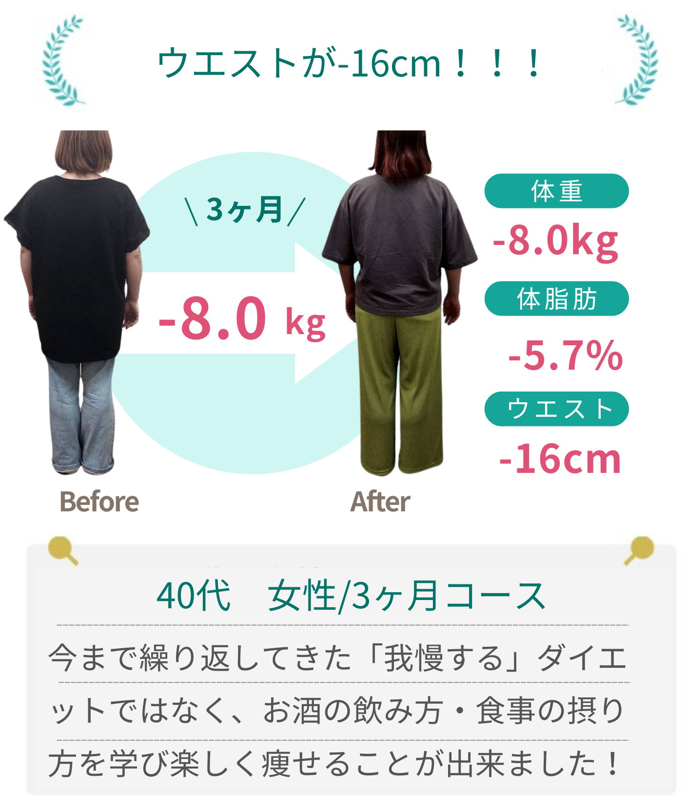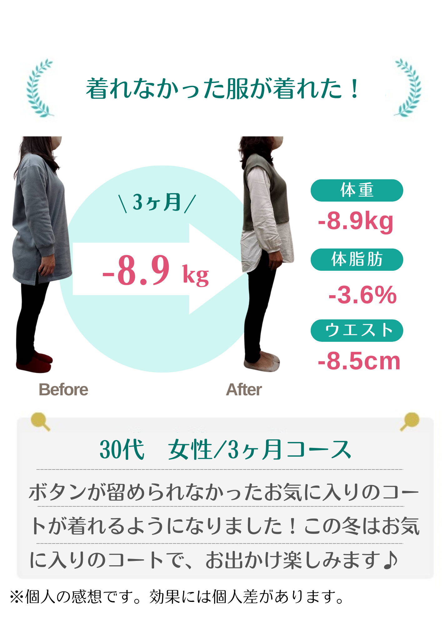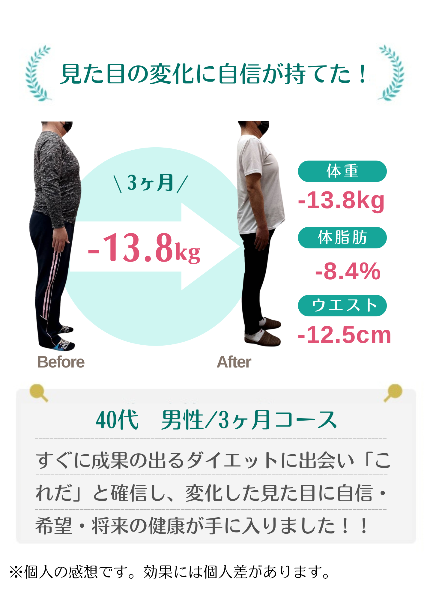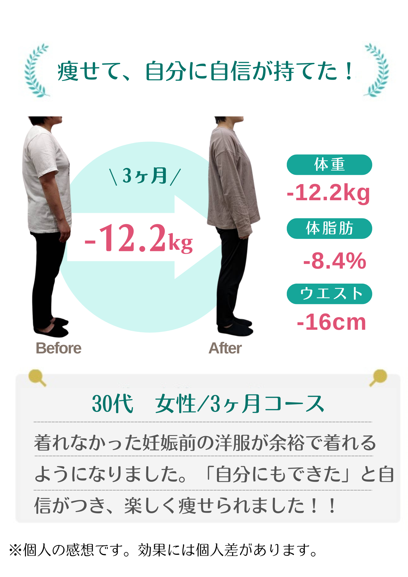当院のダイエットで自分では痩せられない体だと思っていた方が数十年ぶりの体重に戻せました!と喜ばれる方もおります。年齢・性別に関係なく、みなさんしっかり結果が出ています。
