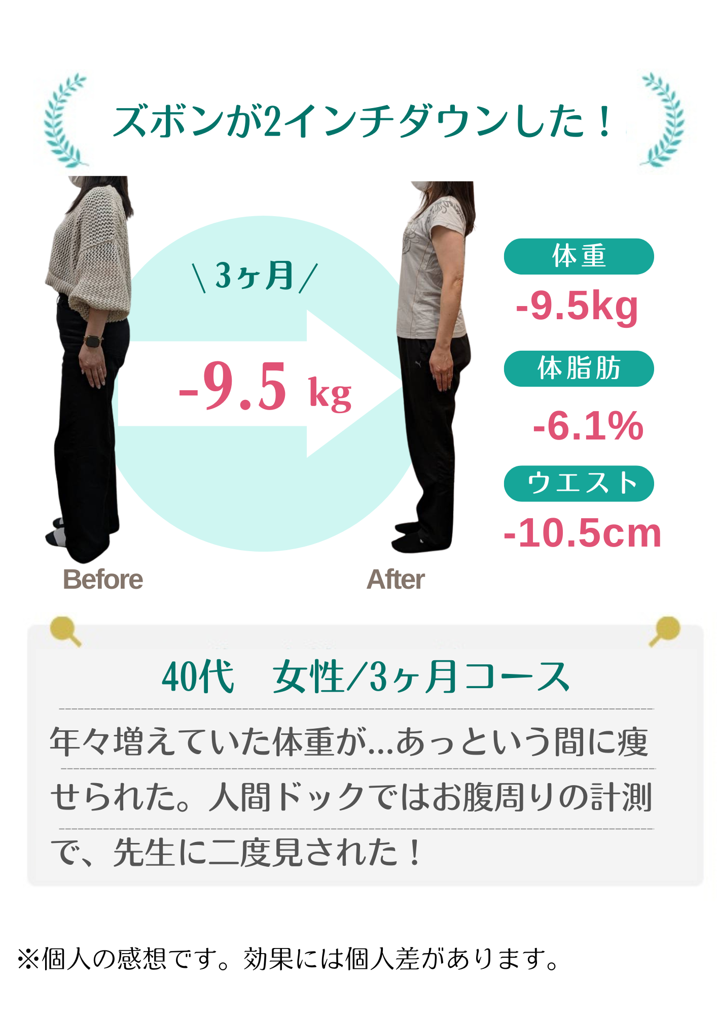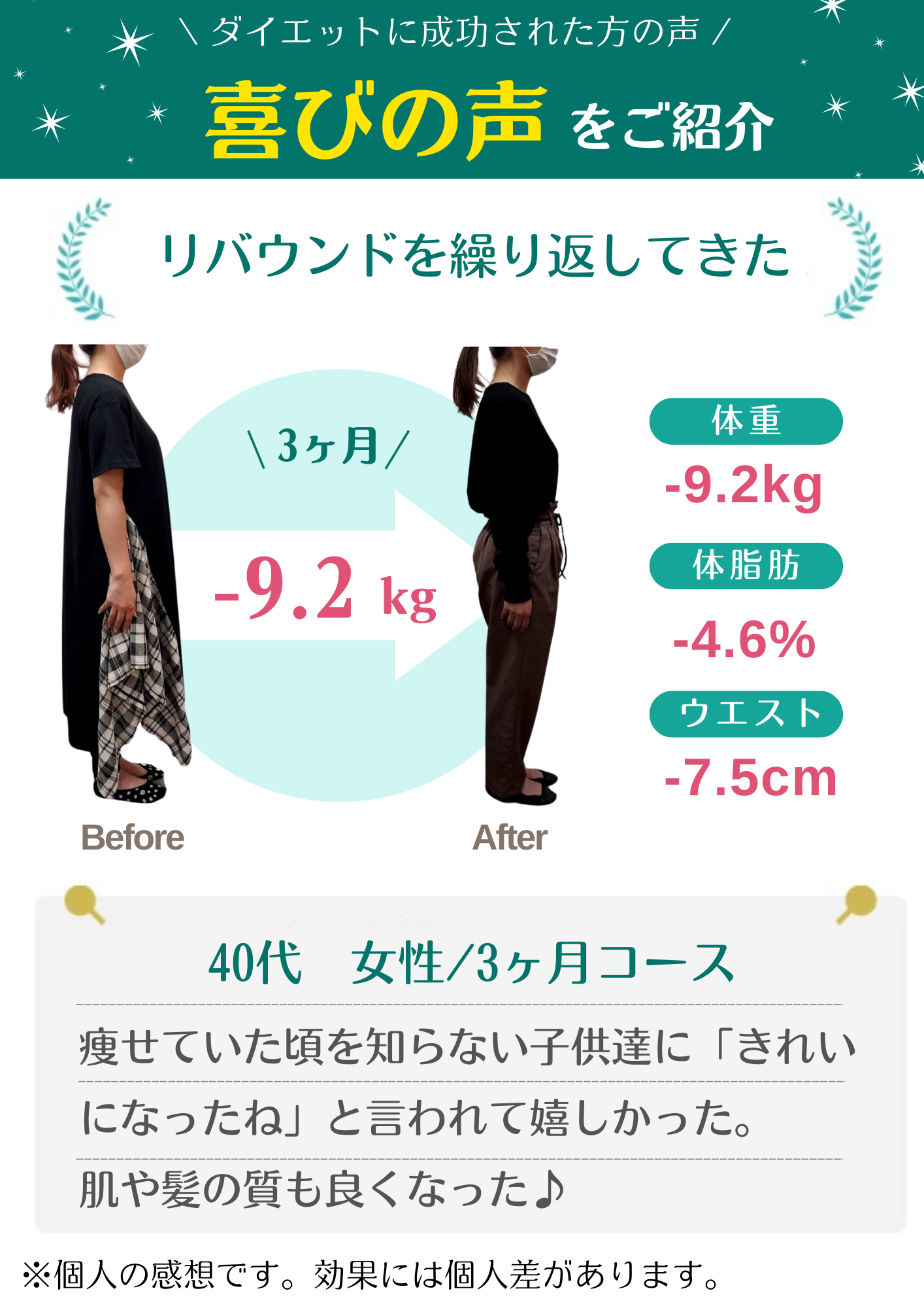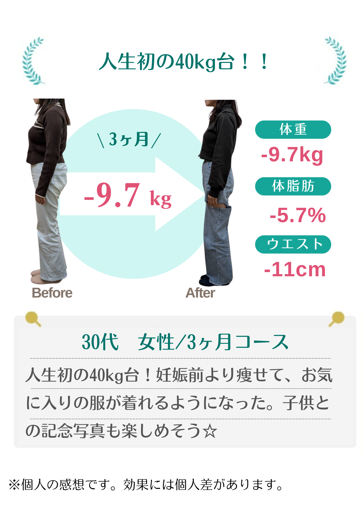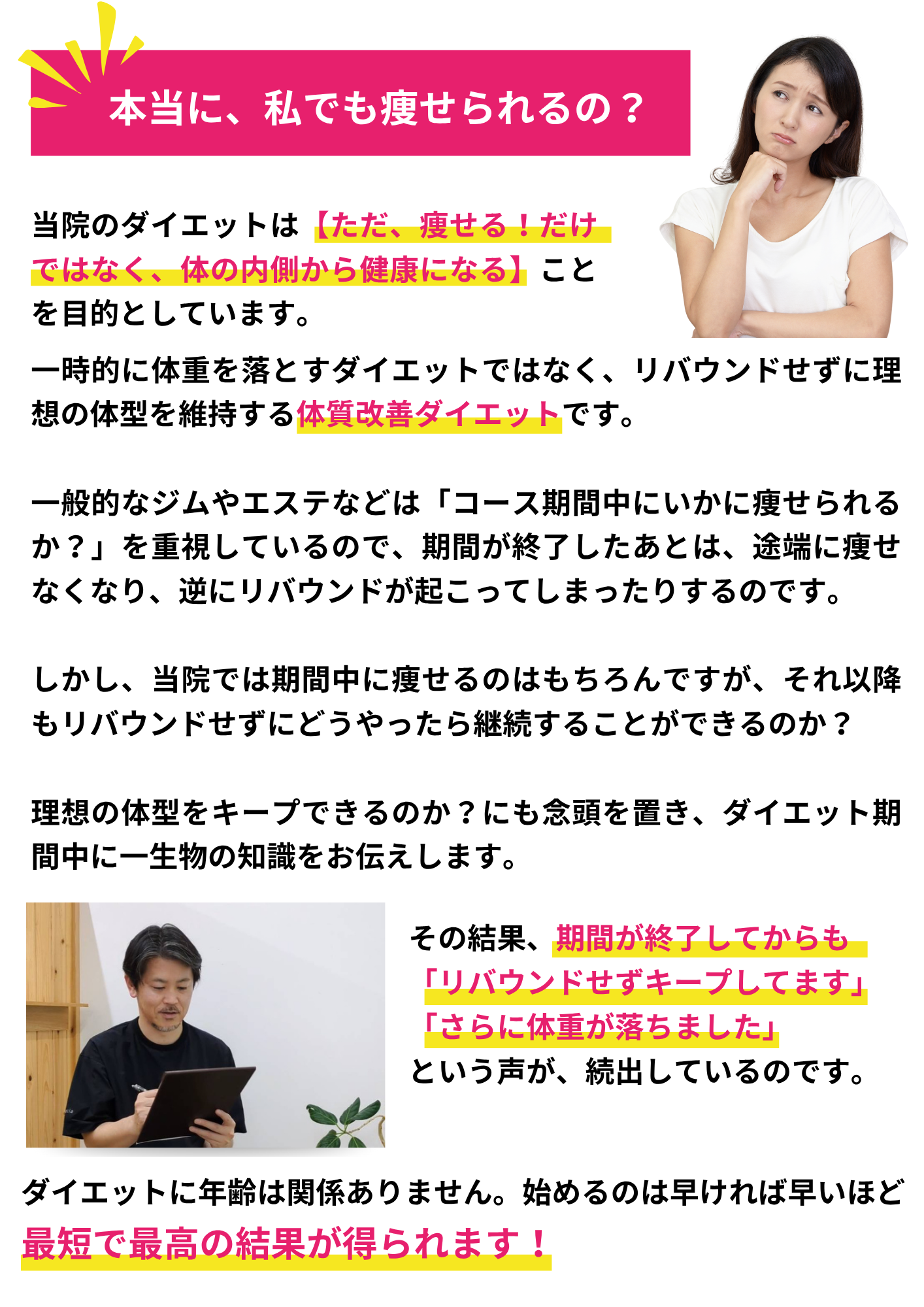 当院のダイエットで自分では痩せられない体だと思っていた方が数十年ぶりの体重に戻せました!と喜ばれる方もおります。年齢・性別に関係なく、みなさんしっかり結果が出ています。
