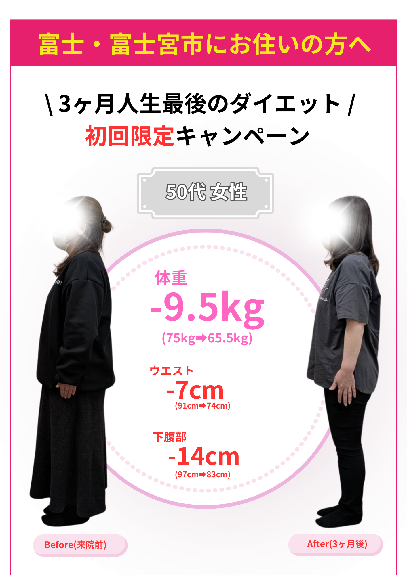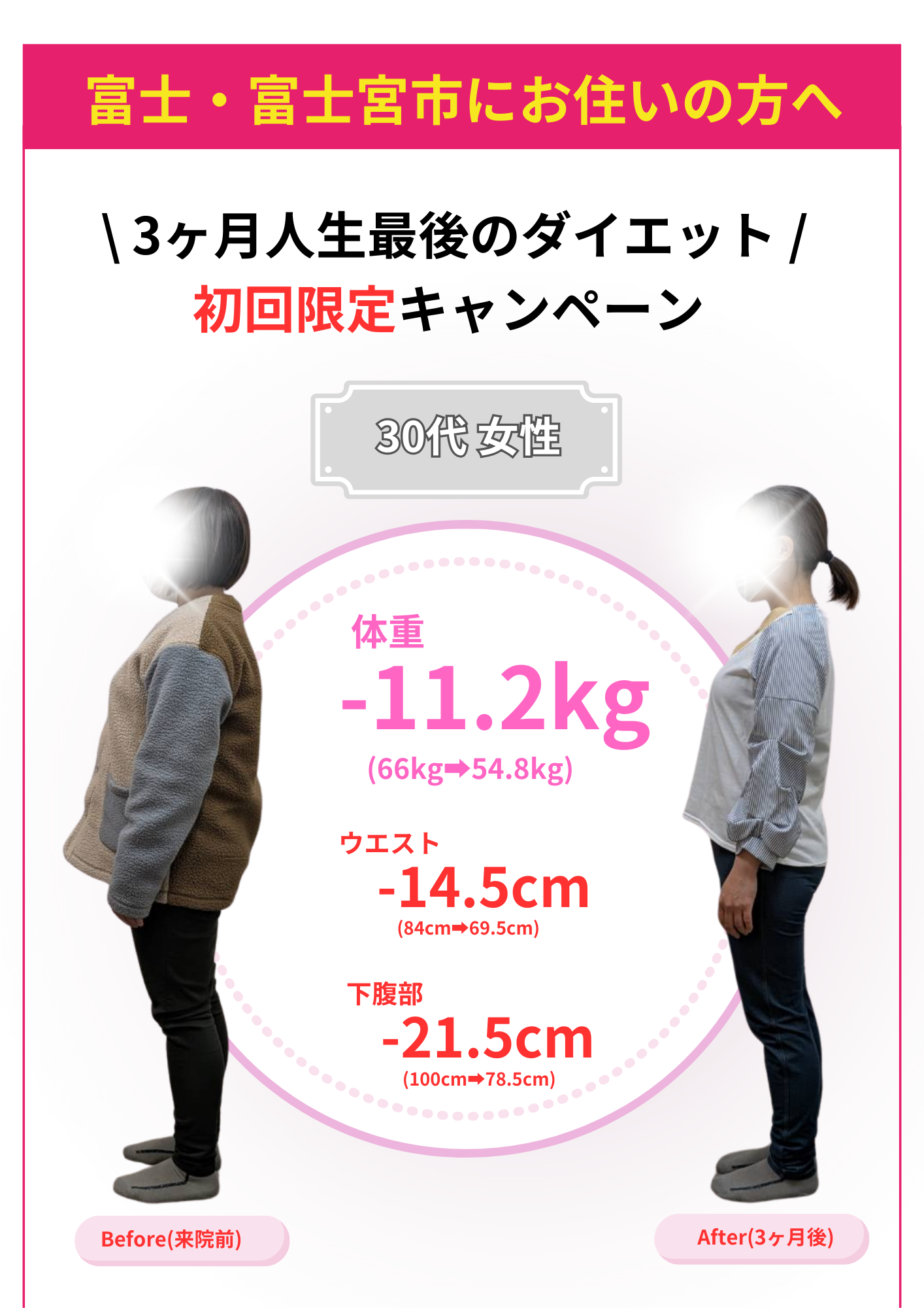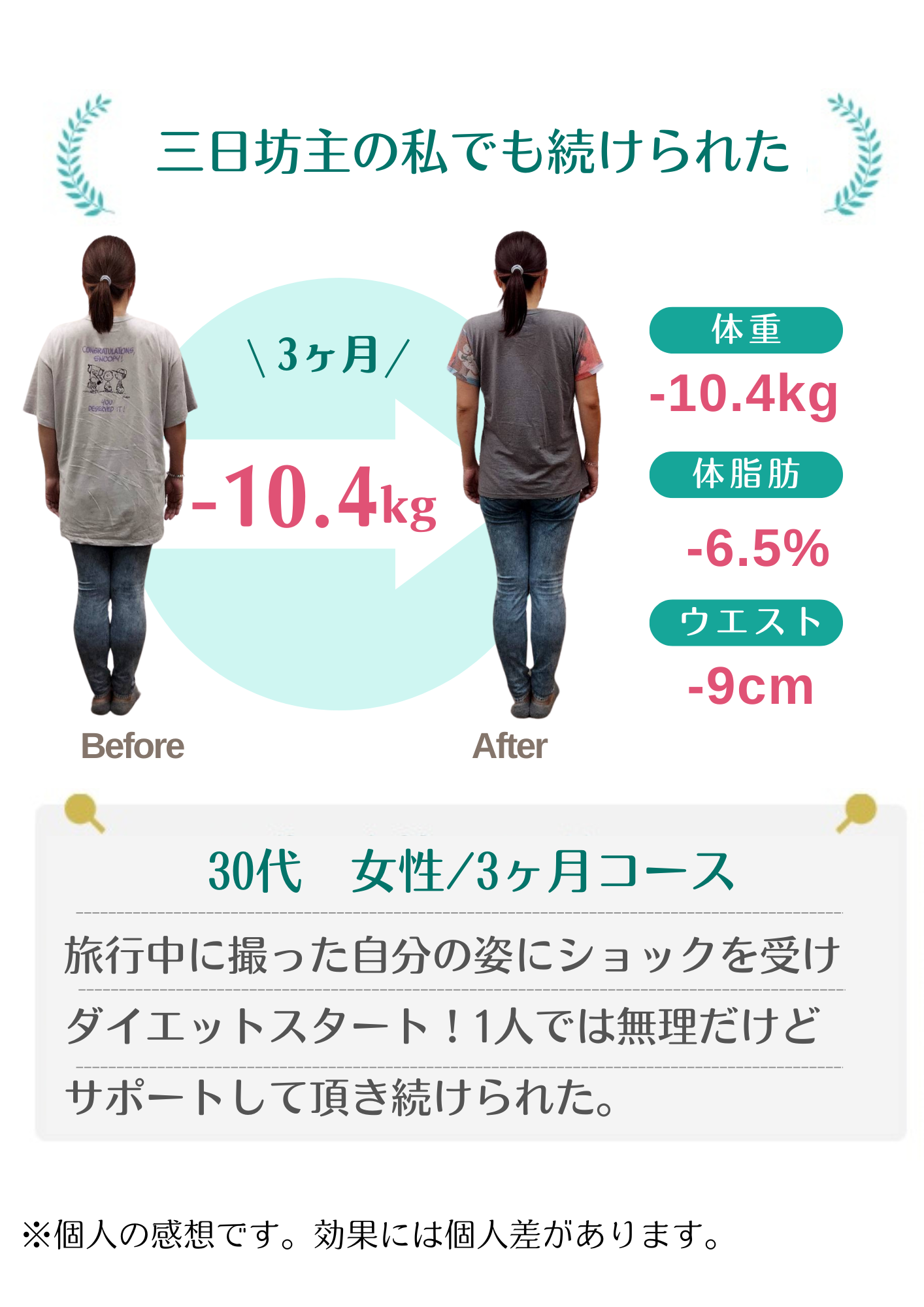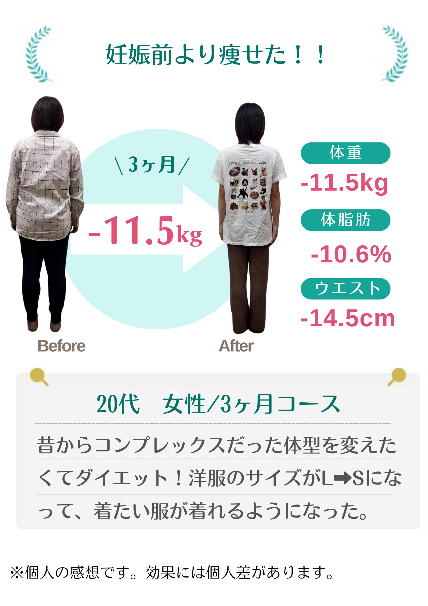 当院のダイエットで自分では痩せられない体だと思っていた方が数十年ぶりの体重に戻せました!と喜ばれる方もおります。年齢・性別に関係なく、みなさんしっかり結果が出ています。