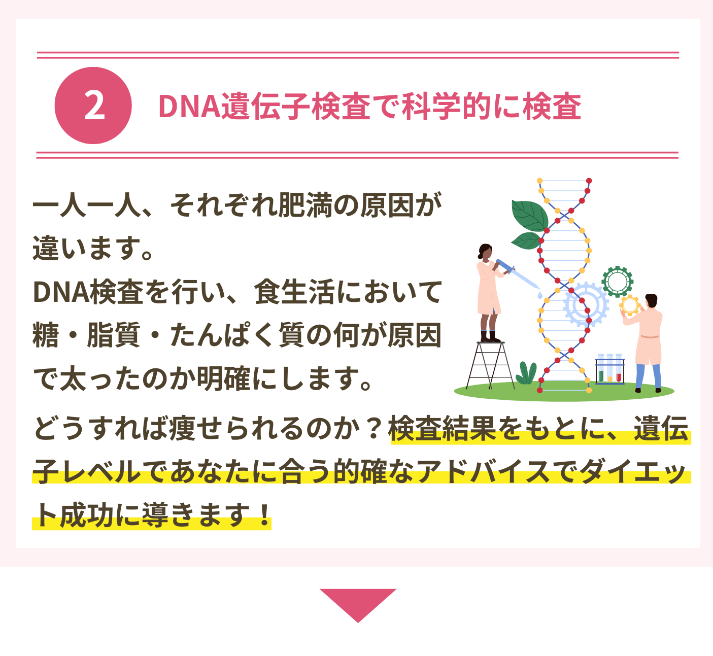 一人一人異なる、生まれ持ったDNAを検査し、何が原因で太りやすくなってるかを明確にしていきます。