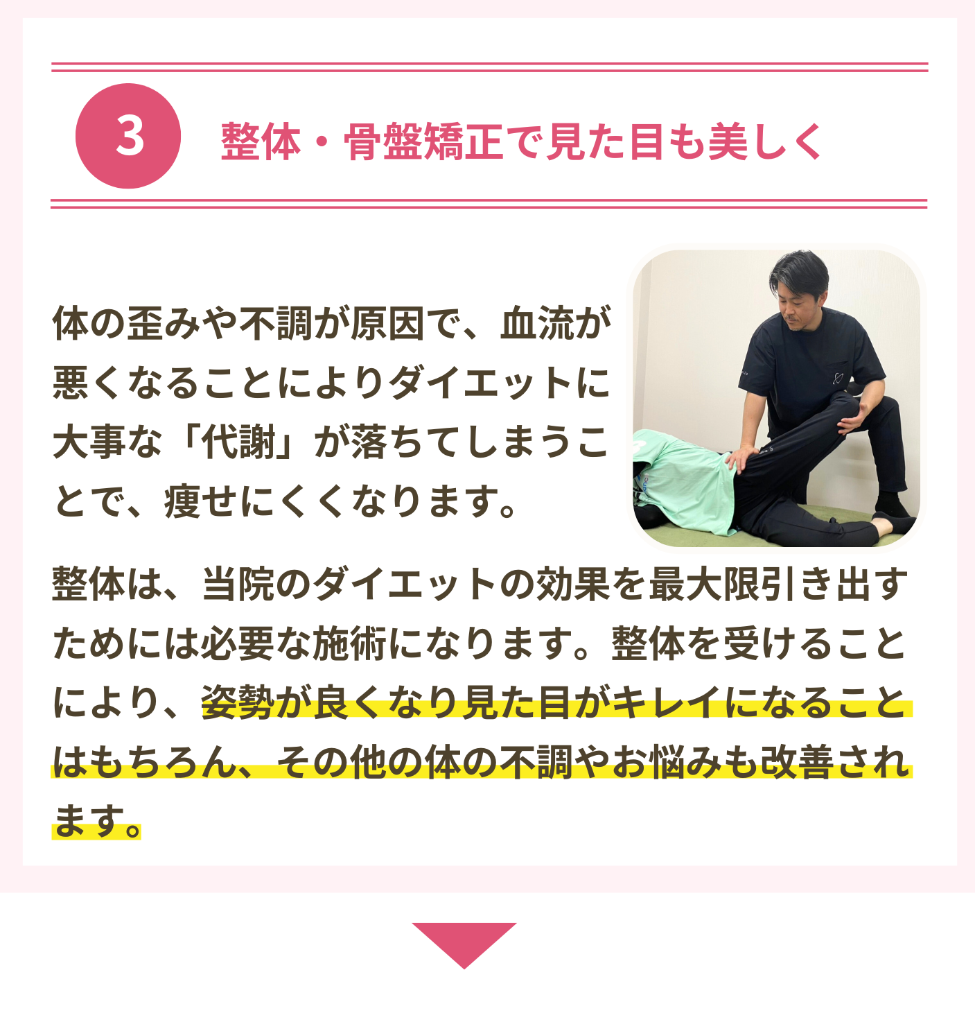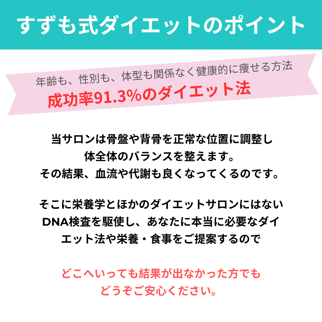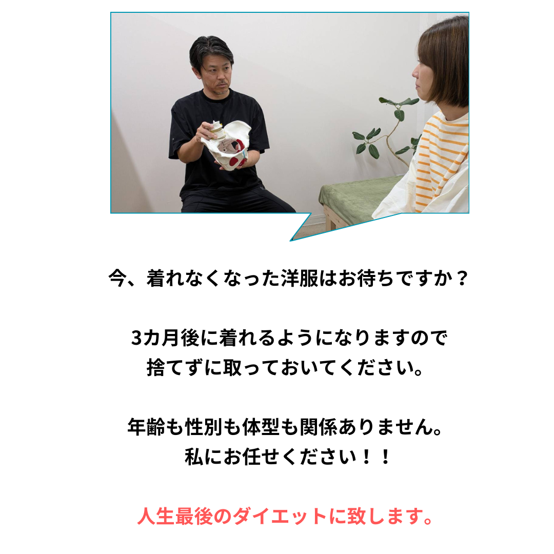 骨盤矯正だけで大幅な減量をすることは難しいですが、体の老廃物を排出しやすくしたり、内臓や自律神経機能とも大きく関わってくるため当院のダイエットには欠かせない要素となってます。姿勢などのスタイルや体の動かしやすさとも関係してきます。